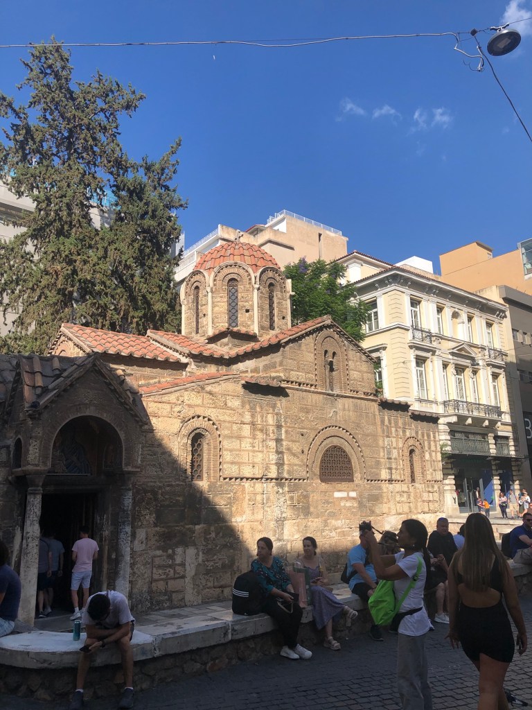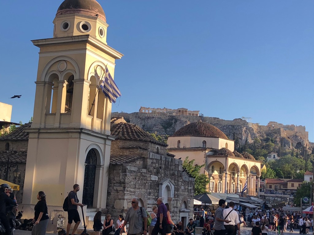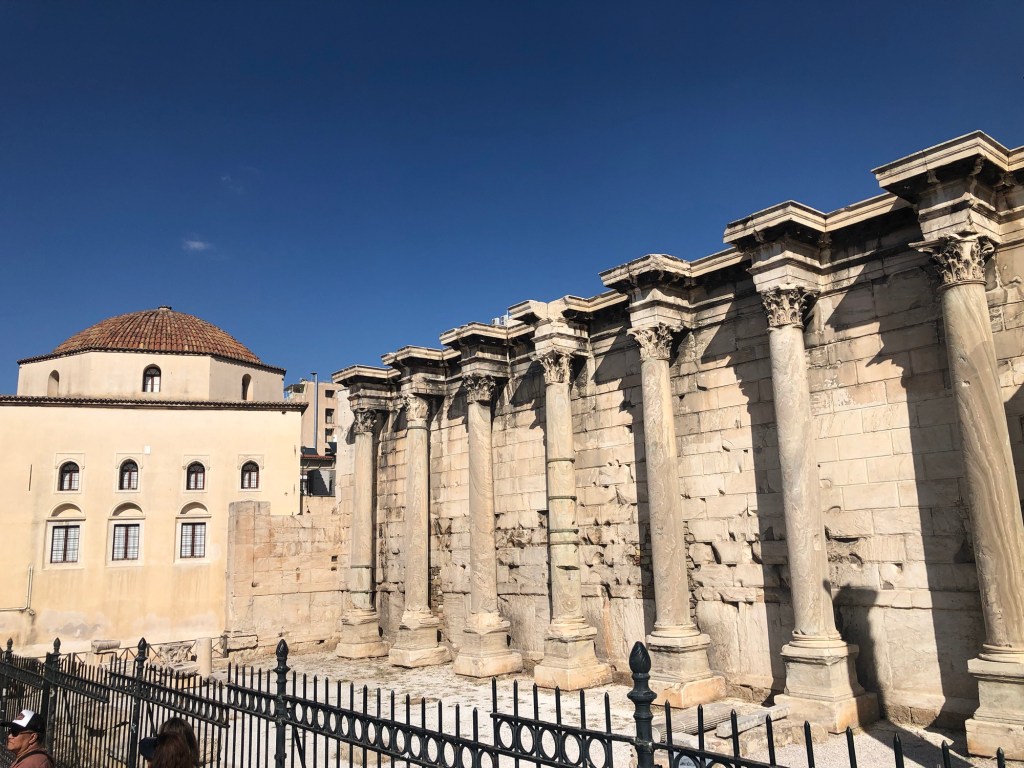 Akropolis’in hemen Kuzeyindeki Monastiraki meydanında, Atina kenti daha Roma İmparatorluğunun hakimiyetinde iken inşa edilen ve Roma’nın en güçlü 5 imparatorundan biri olan Hadrian’ın MÖ 132 yılında inşa ettirerek felsefe okulu ve arşiv olarak da kullanılan Kütüphane binası ile günümüzde Yunan Modern Sanat Müzesi olarak kullanılan ve 1458 yılında Fatih Sultan Mehmet’in İstanbul’u fethine atıfta bulunularak eski bir Bizans Kilisesinden “Fethiye Camii”ne dönüştürülen ve farklı çağ ve kültürlerin sembolik yapılarını birbirleriyle yarışırcasına yan yana görmek mümkün.