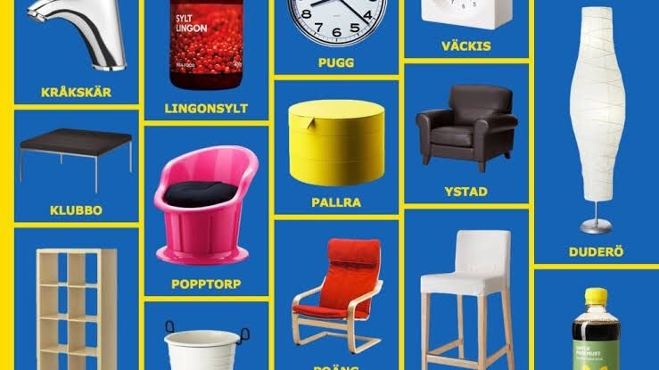 Ürün adı olarak, her ne kadar İsveçce bilmeyenlere bir anlam ifade etmese de; Örneğin “Mobilyalara” İsveç yerleşim yerlerinin, “Banyo Takımlarına” İskandinav göllerinin, “Mutfaklara”: Baharat, şifalı bitki, balık ve mantarların, “Oturma Takımlarına” İsveç kadınlarının, “Döşeme Takımlarına” İsveç saraylarının, “Kitaplıklara” İsveçce mesleklerin, “Nevresim/Yataklara Çiçek ve bitki adlarının, Çocuk Mobilyalarına Memeli hayvan ve kuş türlerinin adları veriliyor. Tüm ürünlerin satış, planlama, üretim ve stok aşamalarında kullanılan ERP (Enterprise Resource Planning) kodları da var tabii. Ama bu ek adlandırma sayesinde ürünler hem anlamlı bir kimlik kazanmış oluyor, hem de sanki Disleksi/Öğrenme Zorluğu Çeken Bay Kamprad’a kolaylık:-) sağlanmış oluyor. İsimlerin İsveç dilinde olmasının, farklı dillere sahip 84 ülkede satılan uluslararası bir firmada bazı zorlukları da yok değil. Örneğin; İsveç dilinde bir ürün adı vermenin diğer dillerde sakıncalı olup olmadığını araştıran bir “Adlandırma ve Dil Araştırma Grubu” kurma zorunluluğunu da beraberinde getiriyor olması:-) çok doğal.