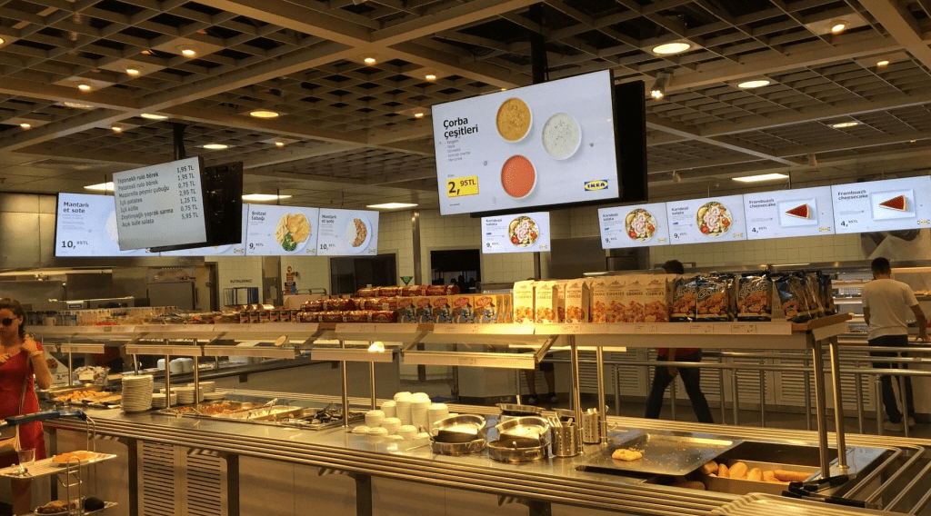 Dolaşmaya başladığınız noktaya ulaştığınızda, dilerseniz alt kattaki satış alanlarına doğru devam edebilir, yorulduysanız ya da dilerseniz Restoran ve Kafeye yönelebilirsiniz. Restoran bölümü self-servis düzeni içinde ve mağazadan alışveriş yapma amacında olmayanların dahi ziyaret etmeyi tercih edeceği kadar ucuz ama bir o kadar da kaliteli. Tüm mağazaların olmazsa olmazı olan bu restoranlar, IKEA’ların toplam cirosunun %5’ini oluşturmakla birlikte kurumsal bazda bir kar merkezi olarak çalışmıyor.